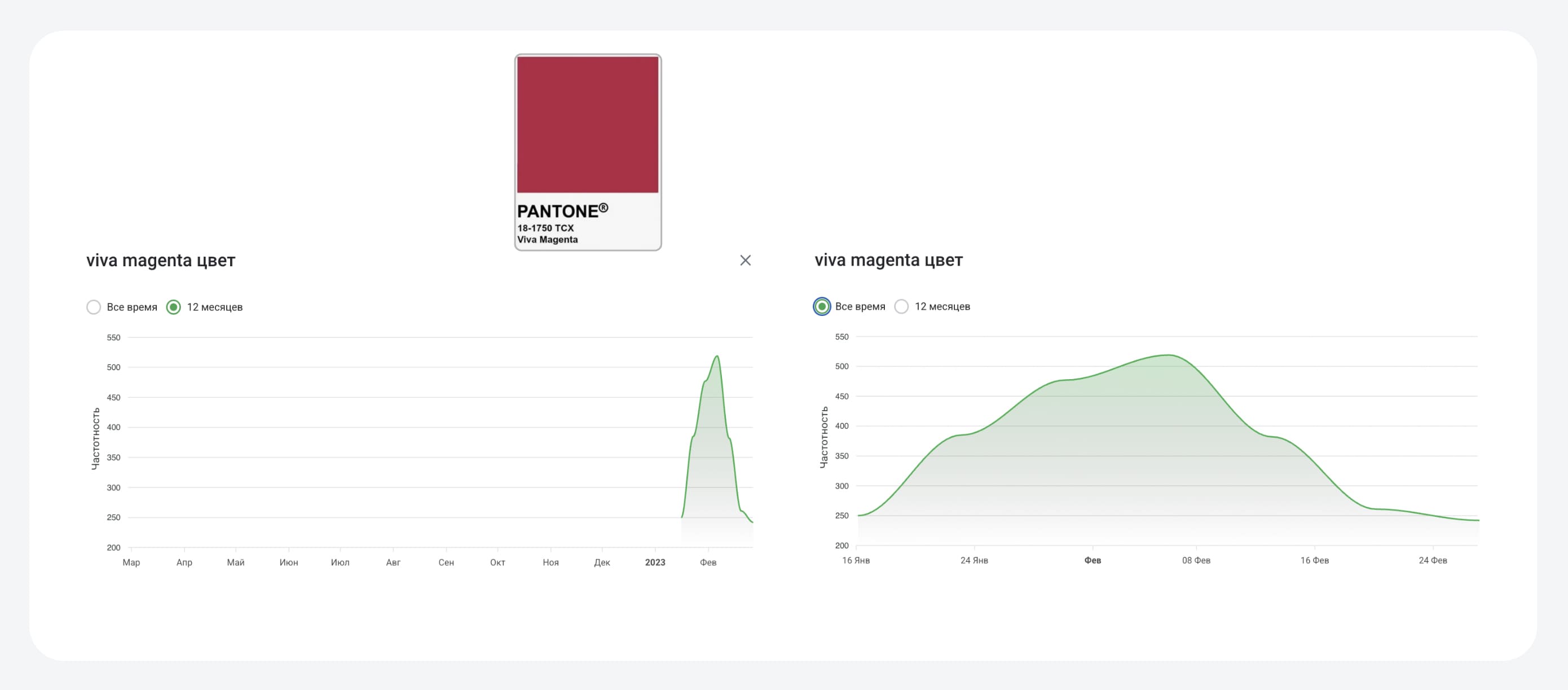 Интересна динамика популярности искусственных трендов. Например, цвет Mocha Mousse, объявленного Pantone главным цветом 2025 года. Пик популярности – февраль 2025: резкий всплеск интереса после официального анонса Pantone. Максимальная частотность запросов в этот период.